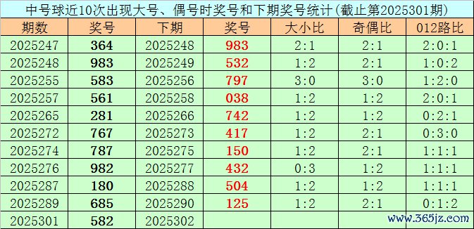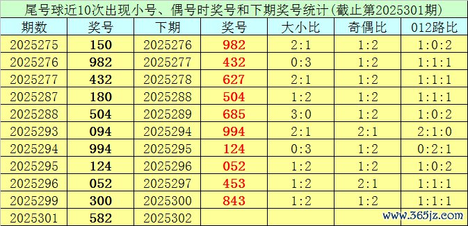 在尾号球前10次开出小 号、偶号类型之后,其下期辞别开出奖号:982、432、627、504、685、994、124、052、453、843,其中号码大小比为2:8,012路比为2:4:4,奇偶比为4:6。