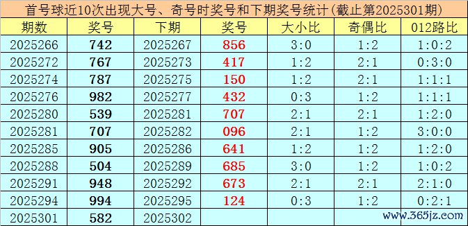 在首号球前10次开出大号、奇号类型之后,其下期辞别开出奖号:856、417、150、432、707、096、641、685、673、124,其中号码012路比为4:5:1,奇偶比为3:7,大小比为5:5。